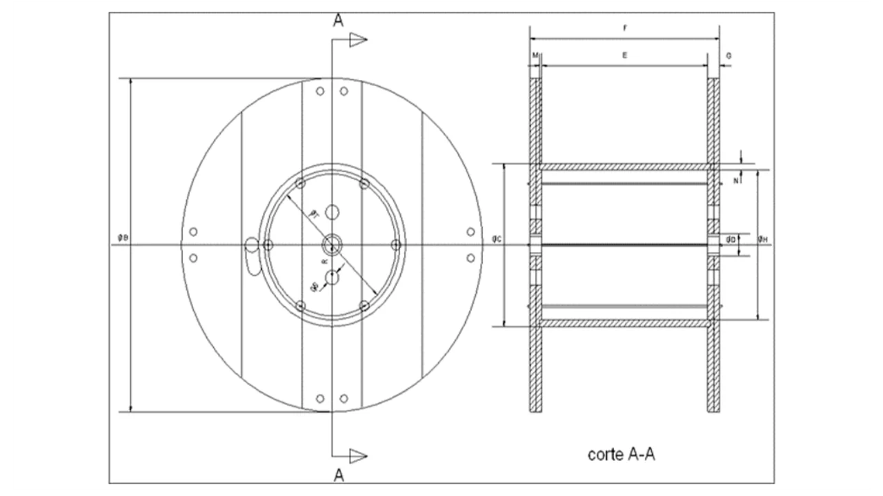 1. Este carretel pode ser fabricado com furo inclinado (Ø 63) ou com lesma (seccionada ou contínua). 2. No caso de carretel com lesma, o mesmo é fabricado com furos de amarração para fixação da ponta do cabo.