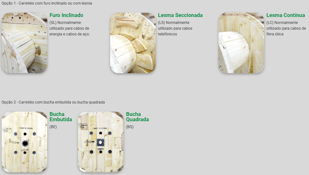 1. Este carretel pode ser fabricado com furo inclinado (Ø 30) ou com lesma (seccionada ou contínua). 2. No caso de carretel com lesma, o mesmo é fabricado com furos de amarração para fixação da ponta do cabo.